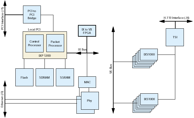 1XP1200網(wǎng)絡處理器以及Dialogic LXT1000以太網(wǎng)接口,該接口包括了對1000BaseT和100BaseTX網(wǎng)絡接口的支持。