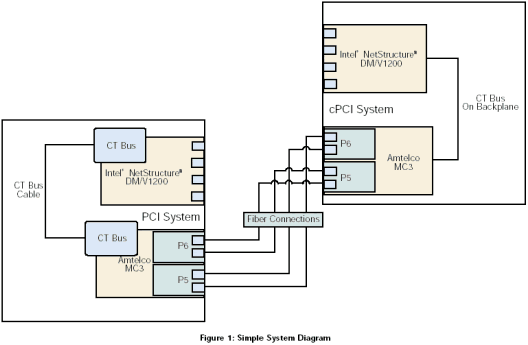 基于Windows操作系統(tǒng)的Dialogic® 系統(tǒng)5.1.1發(fā)布版本特征包1軟件允許通過CT總線多個板卡共享資源。然而,Dialogic卻沒有提供跨服務(wù)器共享CT總線的機(jī)制,實現(xiàn)這種功能需要一種可以跨服務(wù)器進(jìn)行CT總線連接。其中一個可行的解決方案是使用Amtelco