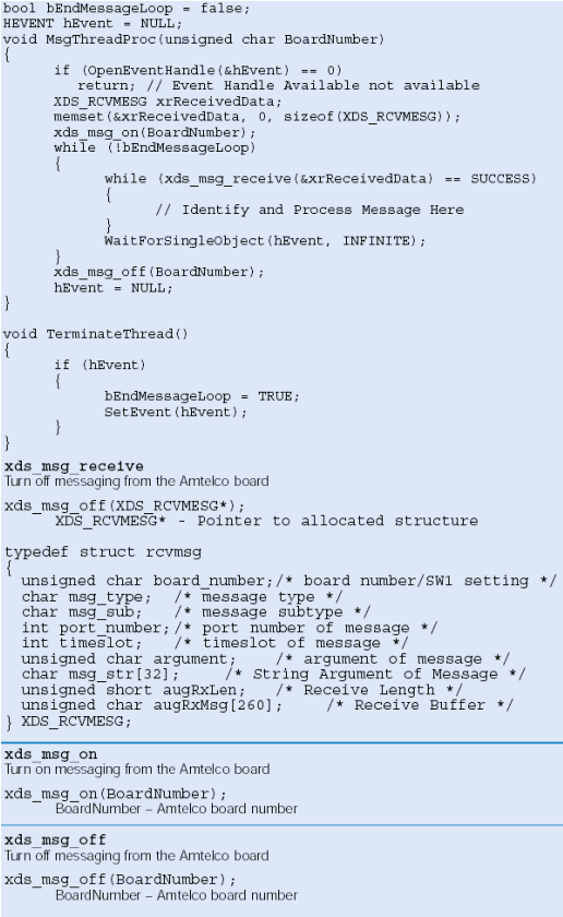 應(yīng)用通過調(diào)用sdx_msg_receive函數(shù)接收消息,在您的應(yīng)用中等待消息必須使用不同的線程完成,這樣可以盡快的報告錯誤。sdx_msg_receive函數(shù)是非阻斷函數(shù),這樣Amtelco具有一個事件對象保護(hù)線程直到消息收到為止。這種線程保護(hù)將耗用CPU100%的資源。