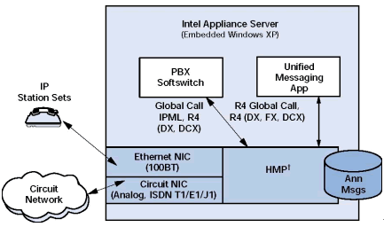 PBX 應(yīng)用可以被實(shí)施在一個(gè)低成本的Dialogic應(yīng)用設(shè)備或一個(gè)使用Dialogic處理器的普通臺(tái)式計(jì)算機(jī)上. 最終用戶可以根據(jù)需要選擇平臺(tái).